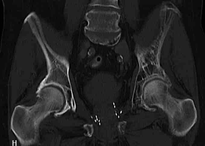 Paget's disease of bone is shown in the left pelvis. Notice the seeds in the prostate after brachytherapy.