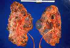 Cyst formation begins in utero from any point along the nephron, although fewer than 5% of nephrons are thought to be involved. As the cysts accumulate fluid, they enlarge, separate entirely from the nephron, compress the neighboring renal parenchyma, and progressively compromise renal function.