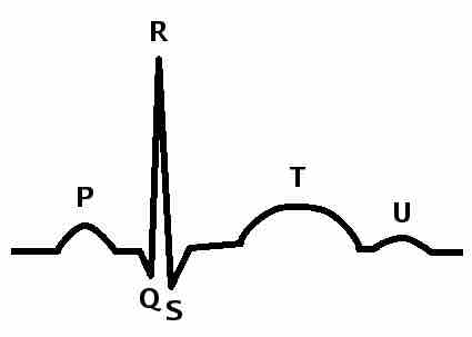 • A typical ECG tracing of the cardiac cycle (heartbeat) consists of a P wave (atrial depolarization), a QRS complex (ventricular depolarization), and a T wave (ventricular repolarization). An additional wave, the U wave (Purkinje repolarization), is often visible, but not always.