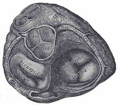 This transverse section of the heart indicates the aortic valve, bicuspid valve, tricuspid valve, pulmonary valve, and left and right coronary arteries.