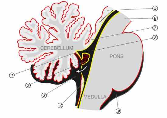 This diagram indicates the (1) posterior medullary velum (2) choroid plexus (3) cisterna cerebellomedullaris of subarachnoid cavity (4) central canal (5) corpora quadrigemina (6) cerebral peduncle (7) anterior medullary velum (8) ependymal lining of ventricle (9) cisterna pontis of subarachnoid cavity