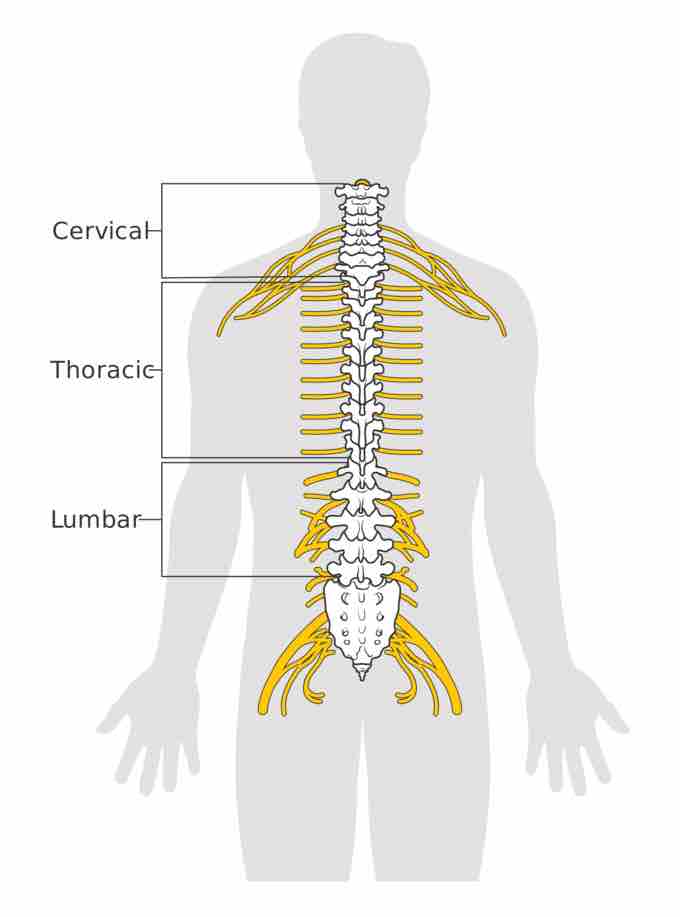 Relationship between the spinal cord and vertebral column, delineating the cervical, thoracic, and lumbar sections.
