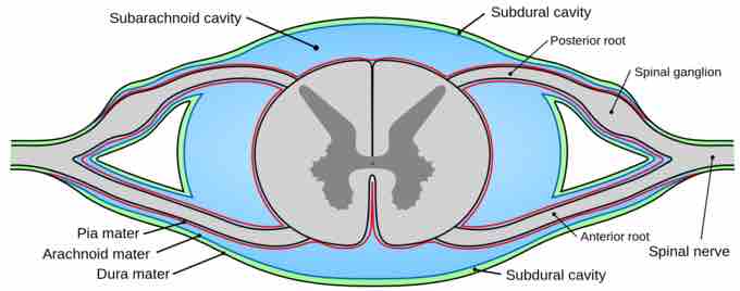 The dura mater is the outermost layer of spinal cord tissue, forming a tough protective coating. The space between the dura mater and the surrounding bone of the vertebrae is called the epidural space. The epidural space is filled with adipose tissue and contains a network of blood vessels. The middle layer is called the arachnoid mater. The pia mater is the innermost protective layer and is tightly associated with the surface of the spinal cord. The space between the arachnoid and pia maters is called the subarachnoid space and is where the CSF is located. It is from this location at the level of the lumbar region that CSF fluid is obtained in a spinal tap.