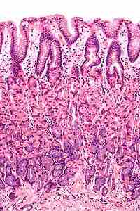 Micrograph showing a cross section of the stomach wall, in the body portion of the stomach. H&E stain.