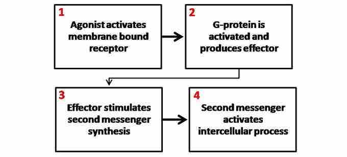 General schematic of second messenger generation following activation of membrane bound receptors. 1. The agonist activates the membrane-bound receptor. 2. G-protein is activated and produces an effector. 3. The effector stimulates a second messenger synthesis. 4. The second messenger activates an intercellular process.