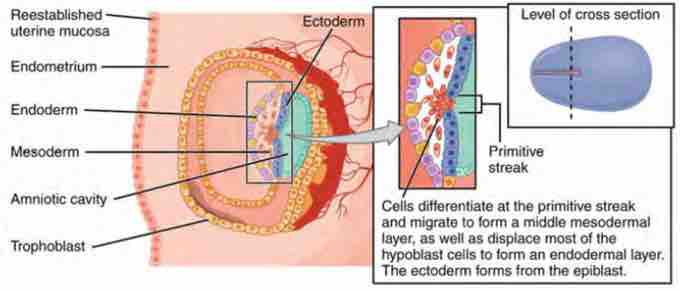 Formation of the three primary germ layers occurs during the first two weeks of development. The embryo at this stage is only a few millimeters in length.