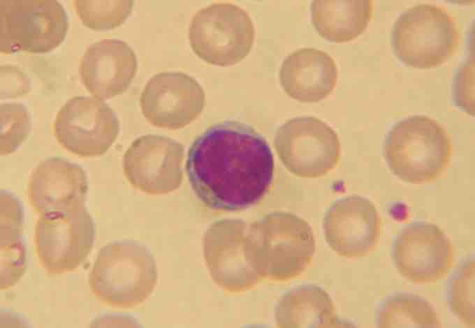 A stained lymphocyte surrounded by red blood cells viewed using a light microscope.