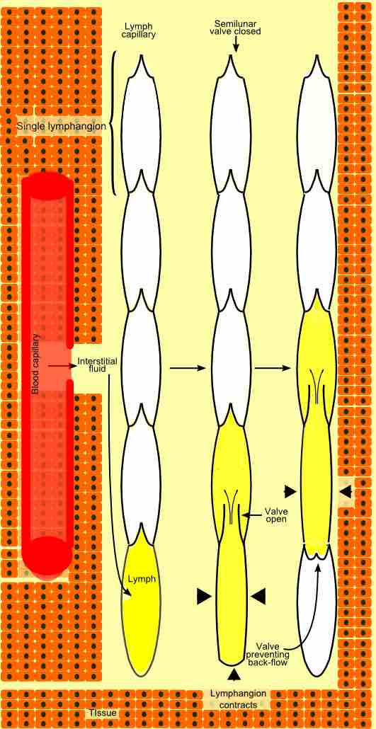 Diagram representing propulsion of lymph through a lymph vessel.