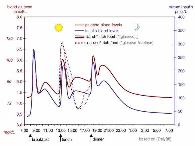 The fluctuation of blood sugar (red) and the sugar-lowering hormone insulin (blue) in humans during the course of a day with three meals. One of the effects of a sugar-rich vs a starch-rich meal is highlighted.