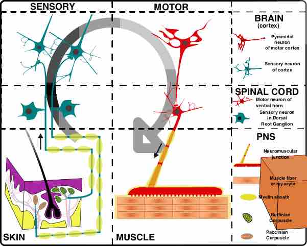Gross organization of the nervous system, with the peripheral nervous system, the spinal, and the cortical levels.