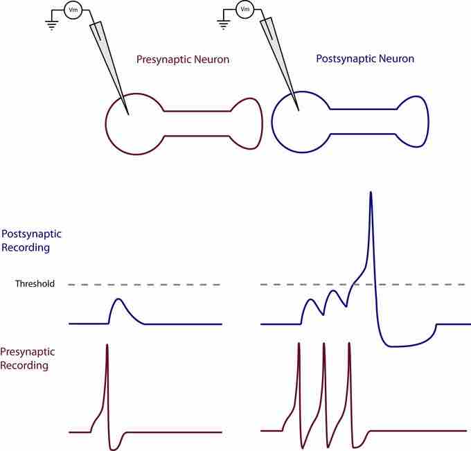 This figure depicts the mechanism of temporal summation in which multiple action potentials in the presynaptic cell cause a threshold depolarization in the postsynaptic cell.
