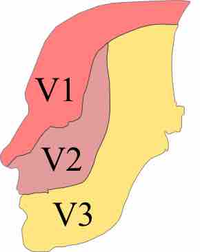 The ophthalmic nerve branch (V1) innervates the bright red area, the maxillary nerve branch (V2) innervates the light red area, and the mandibular nerve branch (V3) innervates the yellow area.