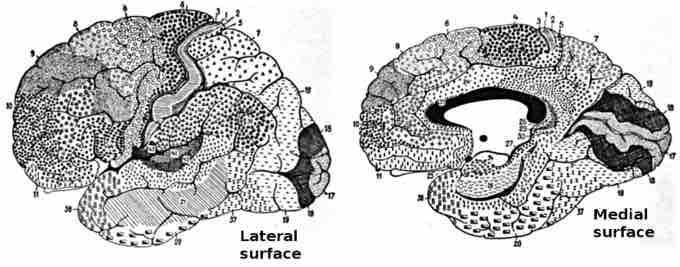 This drawing shows the regions of the human cerebral cortex as delineated by Korvinian Brodmann on the basis of cytoarchitecture.
