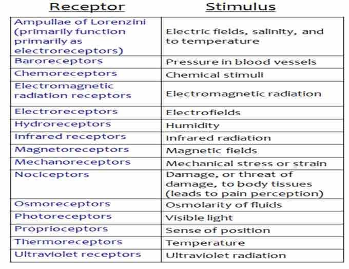 Sensory receptors with corresponding stimuli to which they respond.