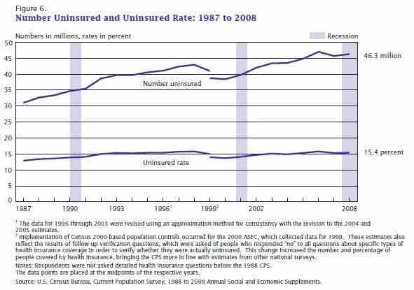 This image depicts the number of uninsured Americans and the uninsured rate from 1987 to 2008.