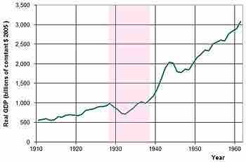 USA annual real GDP from 1910 to 1960, with the years of the Great Depression (1929–1939) highlighted.