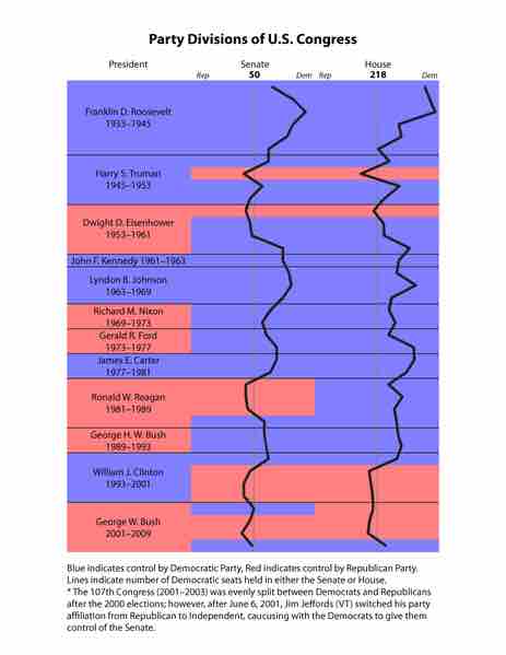 Graphical depiction of the party division of U.S. Congress, 1933-2009.