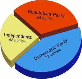 This chart indicates the number of citizens registered as Republicans, Democrats, or Independents. The number of people identifying as independents is rising, indicating that less people are voting solely along traditional party lines.
