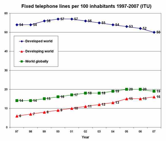 This chart shows the numbers of fixed telephone lines from 1997 to 2007.