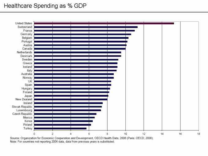 This graph shows the fraction of gross domestic product (GDP) devoted to health care in a number of developed countries in 2006.According to the Organization for Economic Cooperation and Development (OECD), the United States spent 15.3 percent of its GDP on health care in 2006.The next highest country was Switzerland, with 11.3 percent.In most other high-income countries, the share was less than 10 percent.