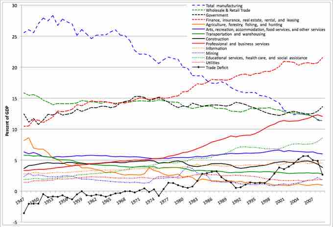 This graphic shows the decline of the manufacturing industry relative to other industries over the course of the past sixty years.