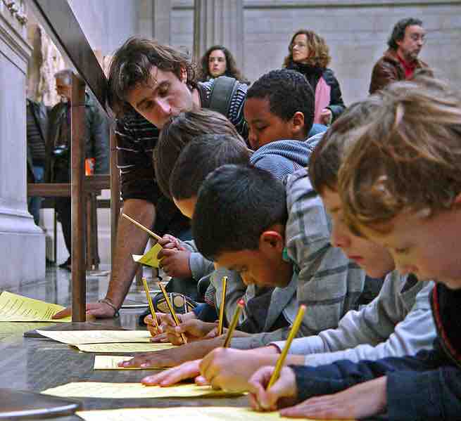 A teacher and young pupils at the British Museum Duveen Gallery.