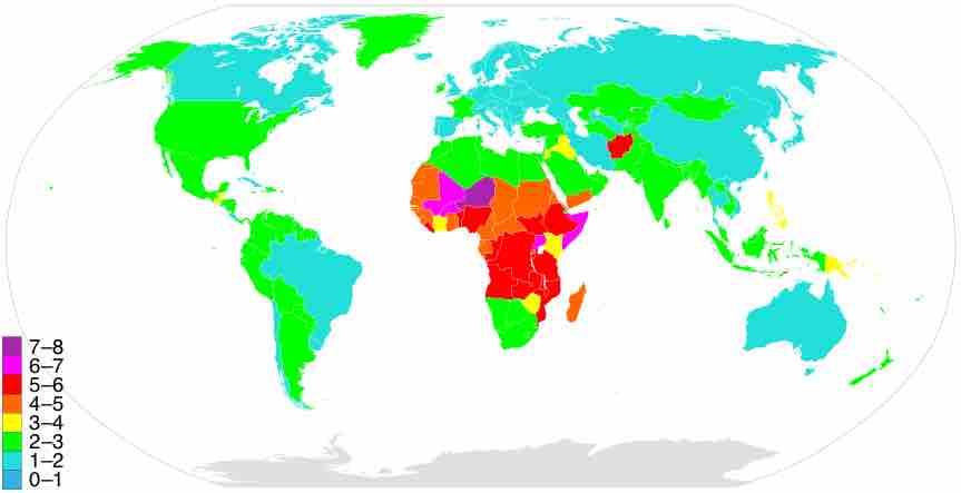 This map shows countries coded by total fertility rates, with 0-1 children at the bottom of the spectrum and 7-8 at the top. A number of factors, such as development index and religious tradition, contribute to variations in fertility rates.
