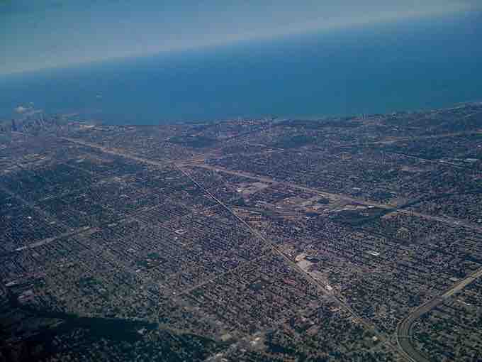 Chicago, seen by air, shows urban sprawl