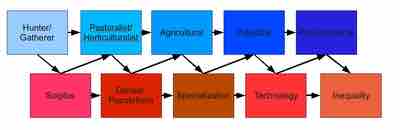 The relationship between the stages of societal development (top row) and its implications (bottom row) are complex and interdependent.