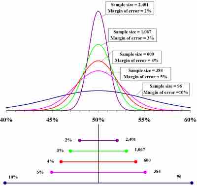 The top portion of this graphic depicts probability densities that show the relative likelihood that the "true" percentage is in a particular area given a reported percentage of 50%. The bottom portion shows the 95% confidence intervals (horizontal line segments), the corresponding margins of error (on the left), and sample sizes (on the right). In other words, for each sample size, one is 95% confident that the "true" percentage is in the region indicated by the corresponding segment. The larger the sample is, the smaller the margin of error is.