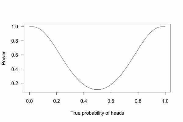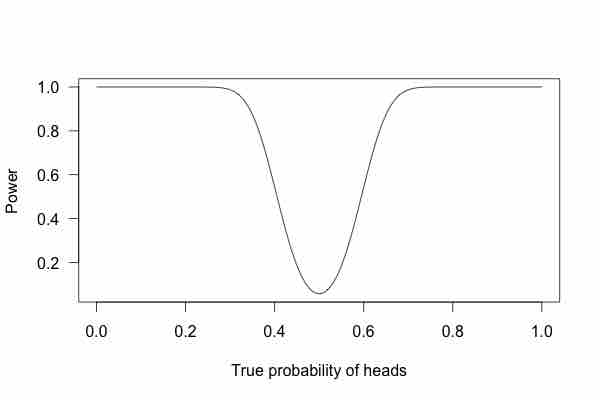 This is called a power curve. Along the horizontal axis, we have the different possibilities for the coin's true probability of getting heads, corresponding to different levels of unfairness. On the vertical axis is the probability that I will conclude the coin is rigged after 10 tosses, based on the probability of the result.