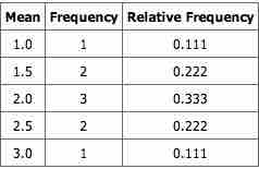 Notice that all the means are either 1.0, 1.5, 2.0, 2.5, or 3.0. The frequencies of these means are shown below. The relative frequencies are equal to the frequencies divided by nine because there are nine possible outcomes.