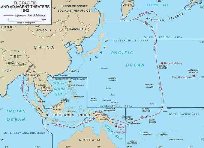 Japanese control of the western Pacific area between May and August 1942. Guadalcanal is located in the lower right center of the map.