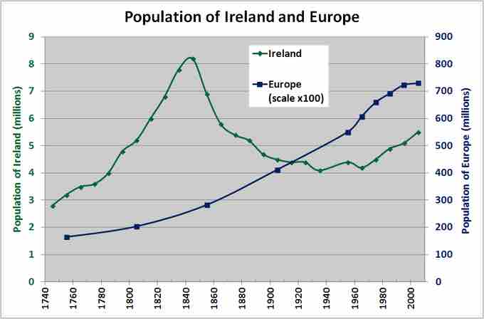 This graph shows the sharp decline in population in Ireland beginning in 1840. By 1855, almost 2 million Irish had emigrated.
