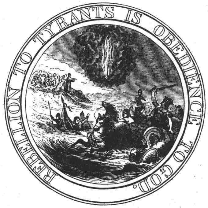 This is an interpretation of the proposed design for the first seal of the United States. Benjamin Franklin suggested it, but it was ultimately not used. The caption reads: "Rebellion to Tyrants is Obedience to God." Religious beliefs were often used to justify colonial rebellion.