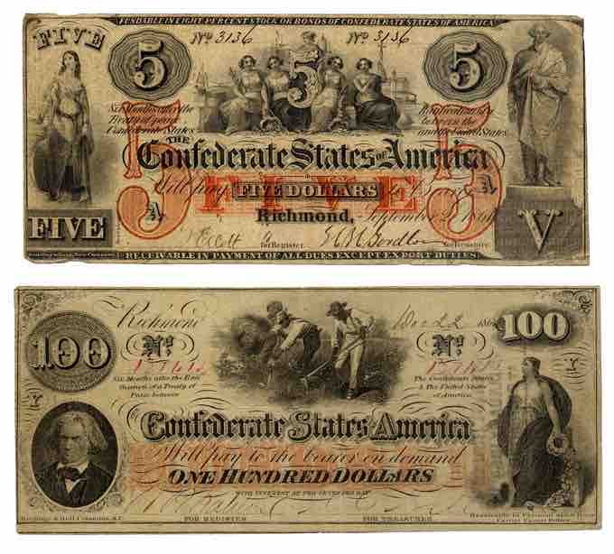 Five-dollar and 100-dollar Confederate States of America banknotes