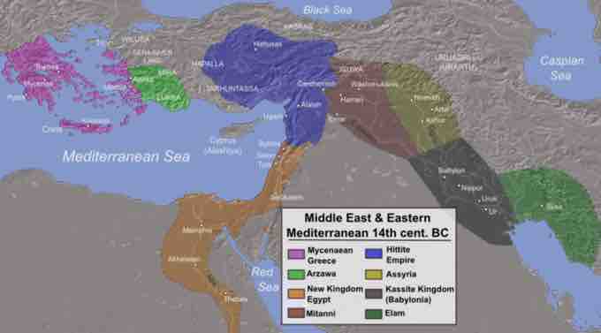 This map shows the extent of the empires of Egypt (orange), Hatti (blue), the Kassite kingdom of Babylon (black), Assyria (yellow), and Mitanni (brown). The extent of the Achaean/Mycenaean civilization is shown in purple.