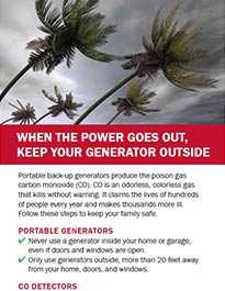 Portable back-up generators produce the poison gas carbon monoxide (CO). CO is an odorless, colorless gas that kills without warning. It claims the lives of hundreds of people every year and makes thousands more ill. Follow these steps to keep your family safe.