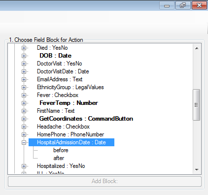 - From Choose Field Block for Action, select and expand the form, page, record, or field that will receive the commands. Expand by clicking the + sign.