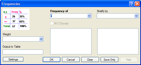• The Frequency column provides the count of individuals that were ill and not ill. The Percent column indicates the percentage of who were ill or not ill.