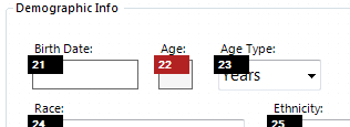 The Disable Tab feature makes the field essentially a Read-Only field that does not receive the cursor. In the example shown in the figures that follow, the Age field is calculated in Check Code based on the value entered for Birth Date. Therefore, the designer of this form wants the cursor to skip over the Age field by disabling its tab.