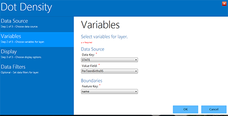 - The Display options dialog appears. Options can be selected here for the color of dots in the map and the value each dot should represent (Dot Value). In this example, the dots are associated with the percentage of teen pregnancy in each state. By specifying “1”, each dot will represent a single teen birth percentage point.