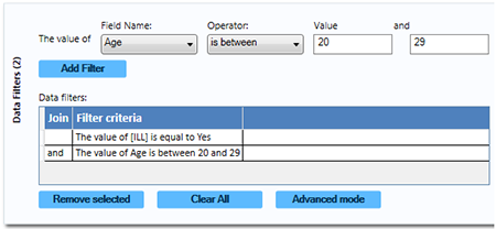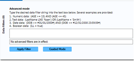 Note: Advanced mode uses the .NET DataView.RowFilter syntax. For more information about this syntax, refer to Microsoft’s website describing the DataView.RowFilter Property.
