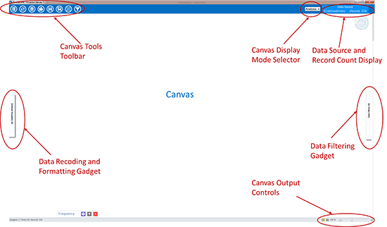 The Visual Dashboard contains seven areas: the Canvas, the Canvas Display Mode Selector, the Data Source and Record Count Display, the Canvas Output Controls, the Canvas Tools Toolbar, the Defined Variables gadget, and the Data Filters Gadget.