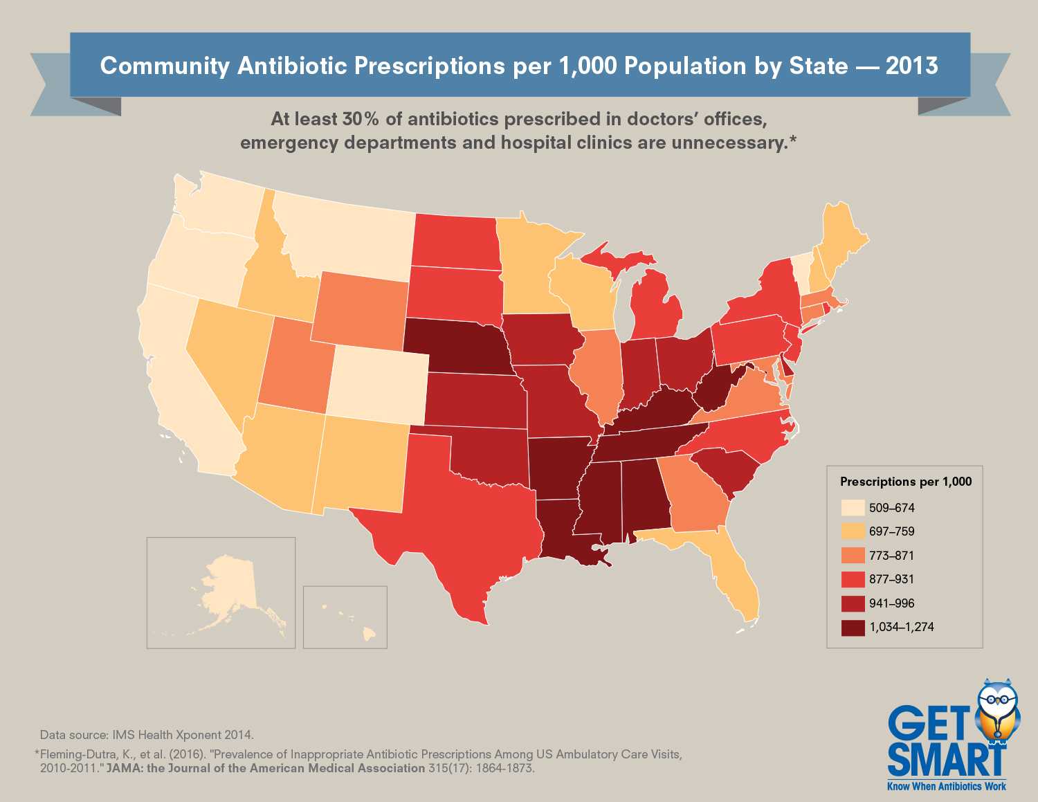 View outpatient antibiotic prescriptions by year, age, antibiotic, antibiotic class, and provider specialty from QuintilesIMS (formerly IMS Health) Xponent data and U.S. Census files.