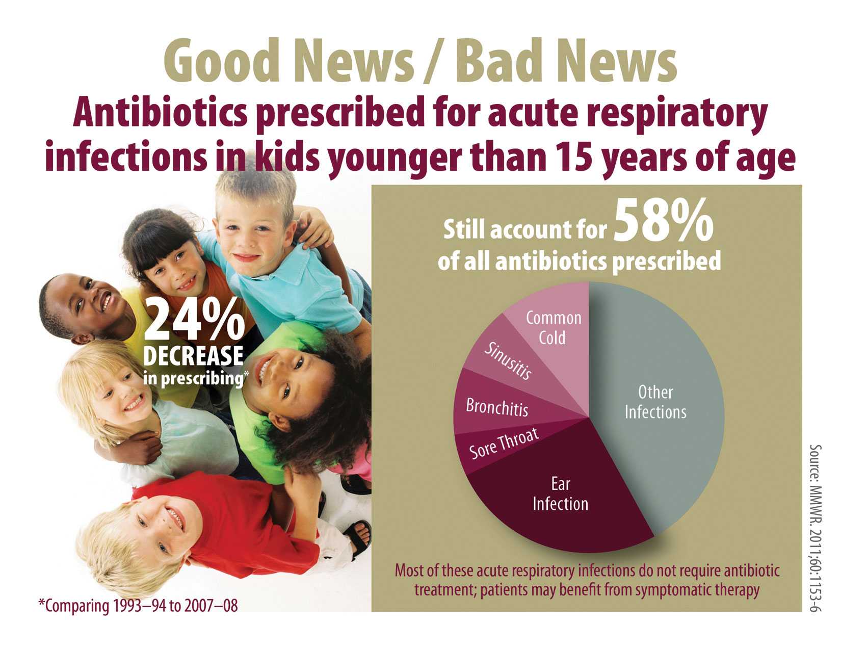Upper respiratory infections account for three quarters of all antibiotics prescribed by office-based physicians, and antibiotics are often used inappropriately (i.e., unnecessarily or the incorrect drug, dose, or duration). Even though prescribing rates have decreased, current data suggest that more than 10 million courses of antibiotics are prescribed each year for viral conditions that do not benefit from antibiotics.