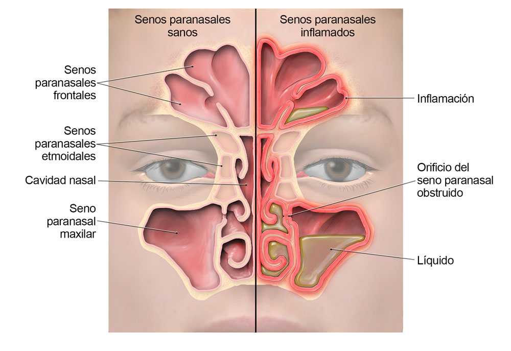 Cuando usted tiene sinusitis, uno o más de los senos paranasales se inflaman y se acumula líquido en ellos, lo que dificulta respirar por la nariz.