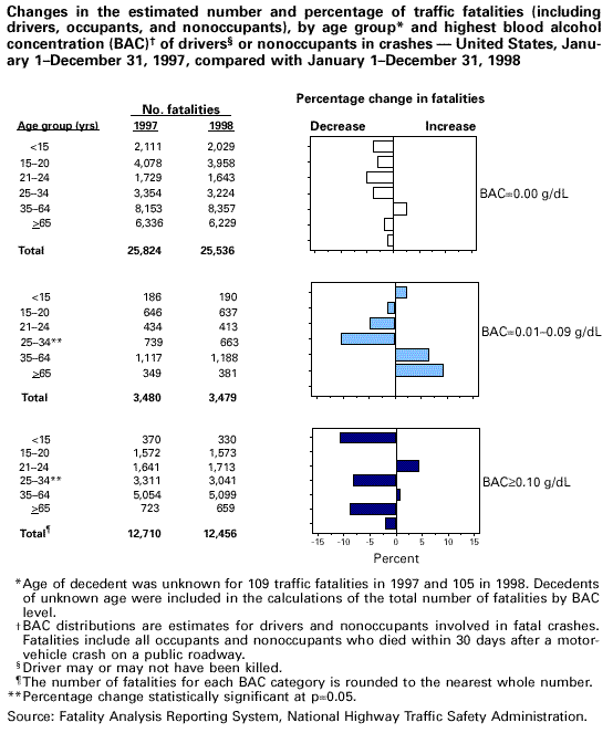Persons using assistive technology might not be able to fully access information in this file. For assistance, please send e-mail to: mmwrq@cdc.gov. Type 508 Accommodation and the title of the report in the subject line of e-mail. Alcohol Involvement in Fatal Motor-Vehicle Crashes -- United States, 1997-1998The following table compares alcohol involvement in fatal motor-vehicle crashes by age group and blood alcohol concentration (BAC) levels for 1997 and 1998. A fatal crash is considered alcohol-related by the National Highway Traffic Safety Administration (NHTSA) if either a driver or nonoccupant (e.g., pedestrian) had a BAC of greater than or equal to 0.01 g/dL in a police-reported traffic crash. Because BACs are not available for all persons in fatal crashes, NHTSA estimates the number of alcohol-related traffic fatalities on the basis of a discriminant analysis of information from all cases for which driver or nonoccupant BAC data are available (1). Overall, the percentage of traffic fatalities that were alcohol related remained constant at 38.4% in 1998 and 38.5% in 1997. From 1997 to 1998, the number of alcohol-related traffic fatalities decreased 1.6% (95% confidence interval=-3.7%-0.6%), with a decease of 2.0% for BACs greater than or equal to 0.10 g/dL (the legal limit of intoxication in most states) and no percentage change (but one less death) for BACs of 0.01-0.09 g/dL. A decrease of 5.8% in the number of alcohol-related traffic fatalities is needed to achieve the national health objective for 2000. Effective strategies for reducing alcohol impaired driving include strict enforcement of impaired driving and minimum legal drinking age laws, sobriety checkpoints, and prompt suspension of licenses of persons arrested for driving while impaired. CDC, in collaboration with the Task Force on Community Preventive Services, is evaluating the effectiveness of community-based strategies to reduce alcohol-related motor-vehicle injuries. Reference
