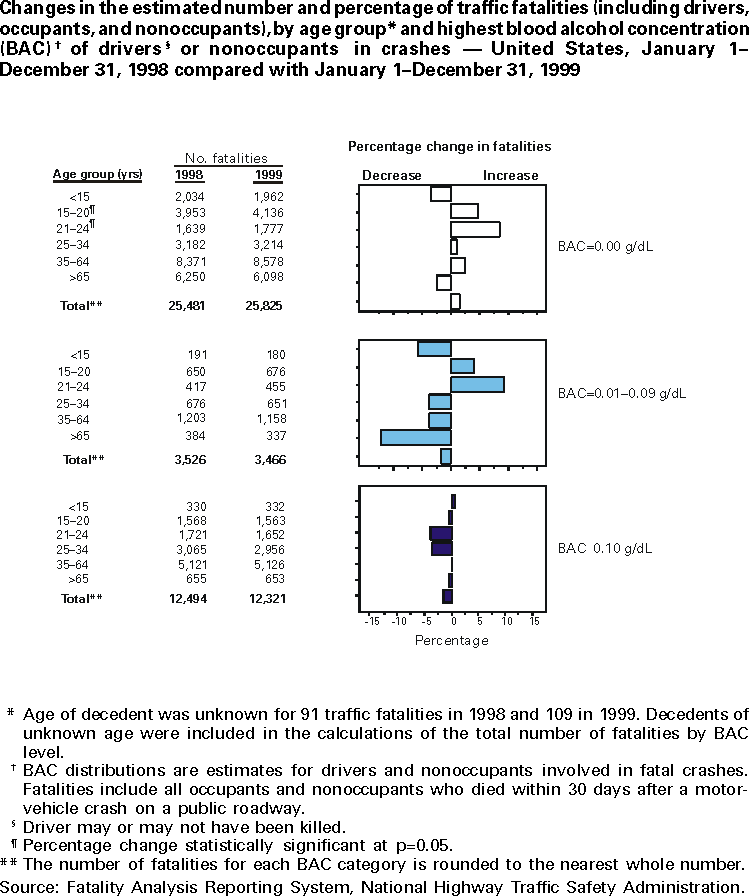 Persons using assistive technology might not be able to fully access information in this file. For assistance, please send e-mail to: mmwrq@cdc.gov. Type 508 Accommodation and the title of the report in the subject line of e-mail. Notice to Readers: Alcohol Involvement in Fatal Motor-Vehicle Crashes ---United States, 1998--1999The following table compares alcohol involvement in fatal motor-vehicle crashes by age group and blood alcohol concentration (BAC) levels for 1998 and 1999. A fatal crash is considered alcohol-related by the National Highway Traffic Safety Administration (NHTSA) if either a driver or nonoccupant (e.g., pedestrian) had a BAC of >0.01 g/dL in a police-reported traffic crash. Because BACs are not available for all persons in fatal crashes, NHTSA estimates the number of alcohol-related traffic fatalities on the basis of a discriminant analysis of information from all cases for which driver or nonoccupant BAC data are available (1). From 1998 to 1999, the number of alcohol-related traffic fatalities decreased 1.5% (95% confidence interval [CI]=--3.6%--0.7%). For BACs >0.10 g/dL (the legal limit for intoxication in most states), fatalities decreased 1.4% (95% CI=--3.8%--1.1%), and for BACs of 0.01--0.09 g/dL, fatalities decreased 1.7% (95% CI=--2.9%--1.6%). Reference