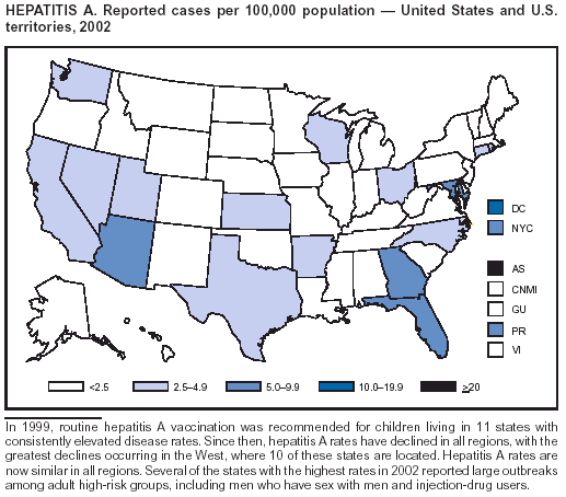 Shapiro CN, Coleman PJ, McQuillan GM, Alter MJ, Margolis HS. Epidemiology of hepatitis A: seroepidemiology and risk groups in the USA. Vaccine 1992;10(suppl 1):S59--S62.